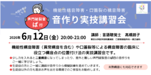 一般社団法人ことばサポートネット主催 「機能性構音障害・口蓋裂の構音障害の構音障害  音作り実技講習会 〜声門破裂音のぱ行編〜」開催のお知らせ